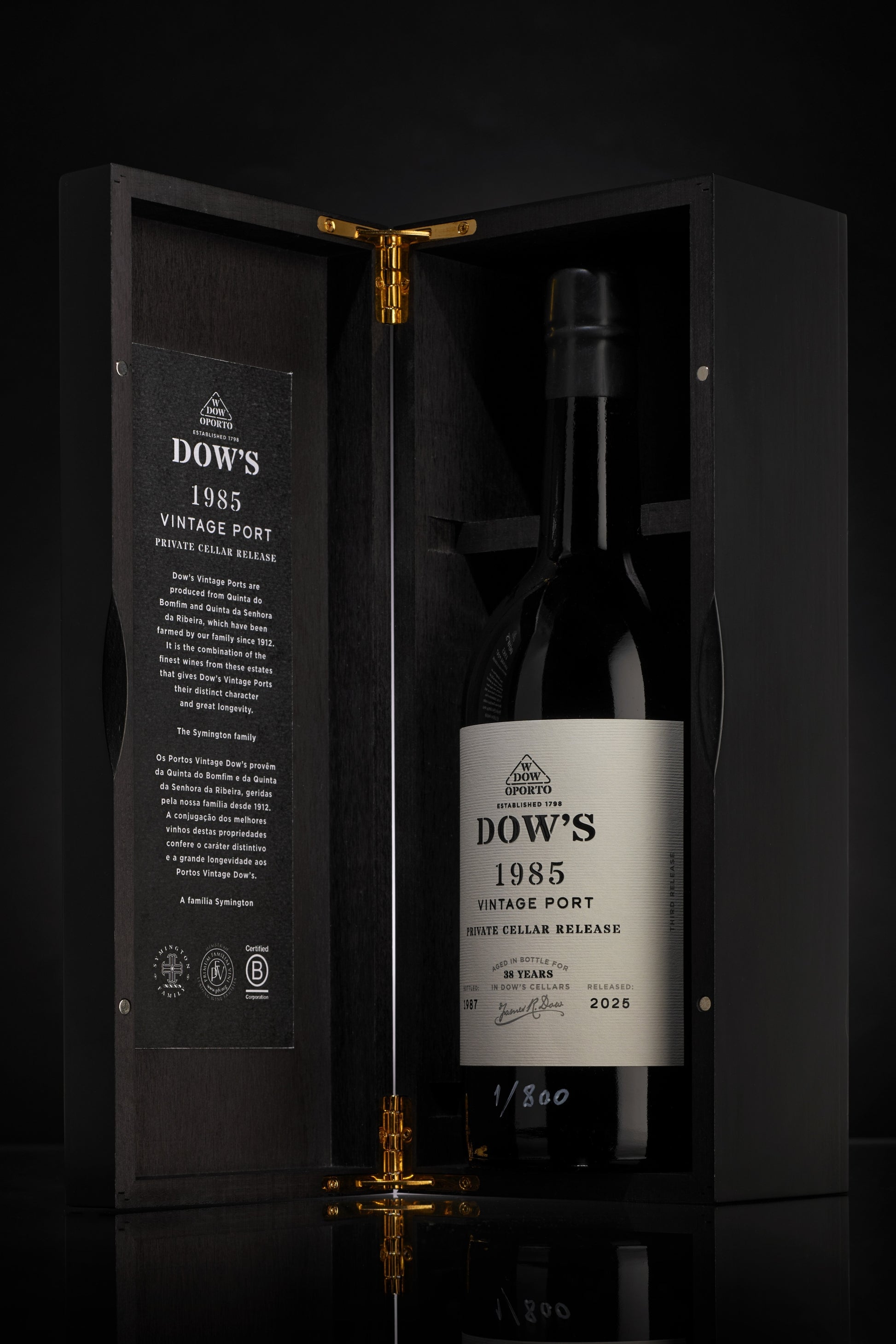 Cada garrafa destes 1985 Private Cellar Releases foi individualmente avaliada e recortada quando necessário. Inspirando-se no património da Dow’s, Graham’s e Warre’s, a família criou rótulos distintos e caixas de apresentação que sublinham a proveniência impecável e a qualidade garantida dos vinhos. Todas as garrafas são numeradas individualmente e indicam as datas de engarrafamento, recortagem e lançamento.